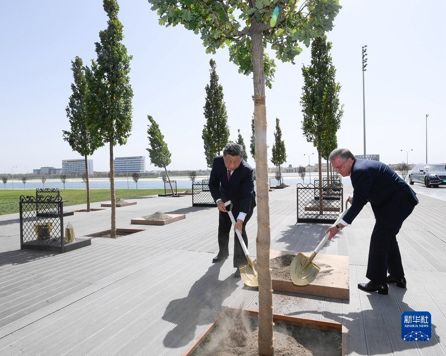 宴会结束后,米尔济约耶夫邀请习近平在撒马尔罕国际会议中心北门外广场共同种下一棵橡树。两国元首一道为树苗培土、浇水。橡树代表着长久生命力,象征着中乌友谊枝繁叶茂、生生不息。